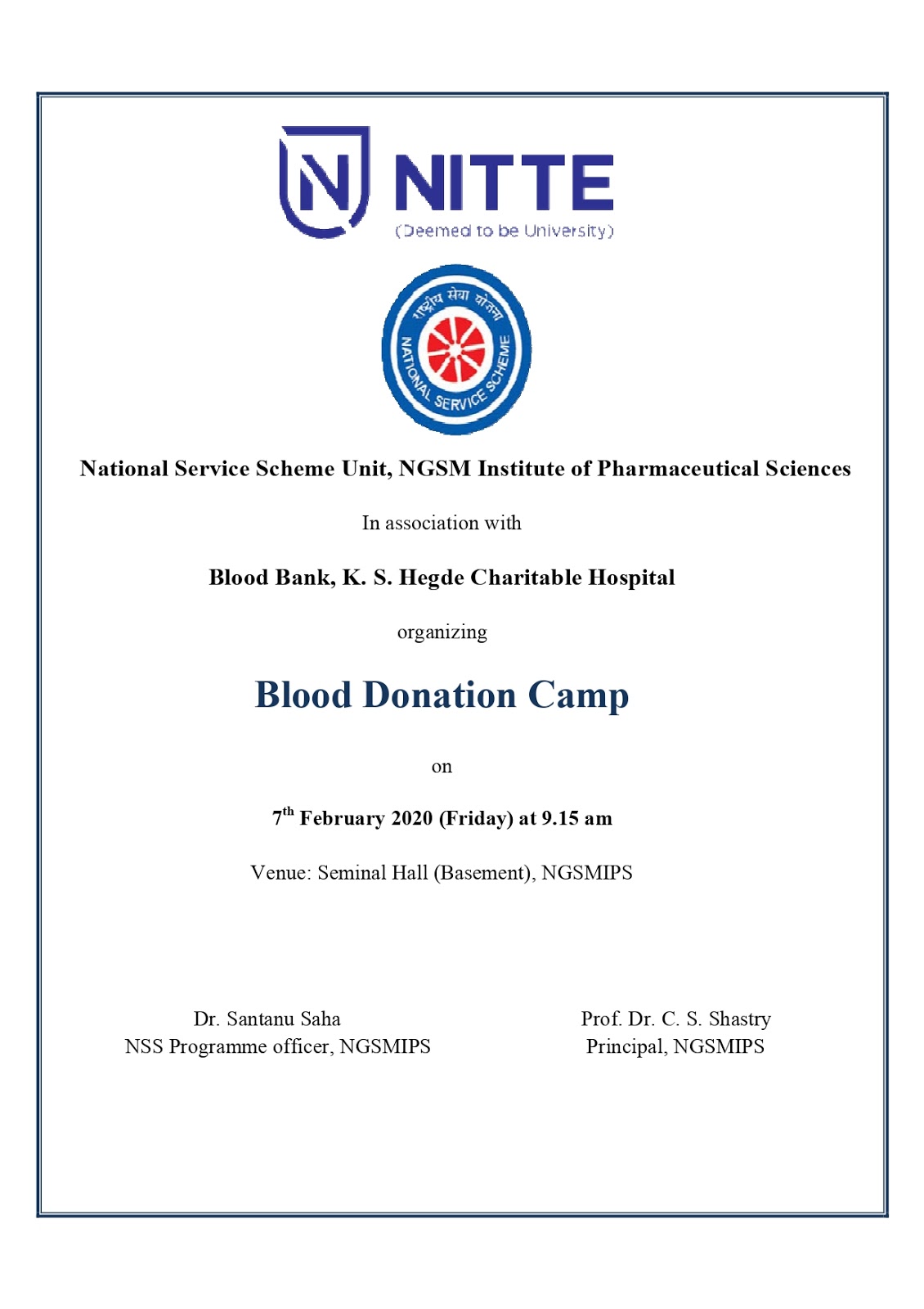 Nitte Invitation Of Blood Donation Camp At Ngsmips On 7th February 2020 - Half an hour worth three lives.